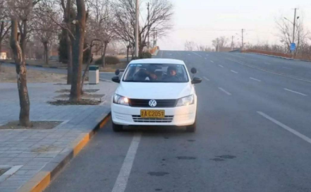 第三步:向左打方向,调整车身与路沿的距离。当车头右侧三分之一处与边缘线重合的时候,此时车身距离路沿的距离刚好在30cm。