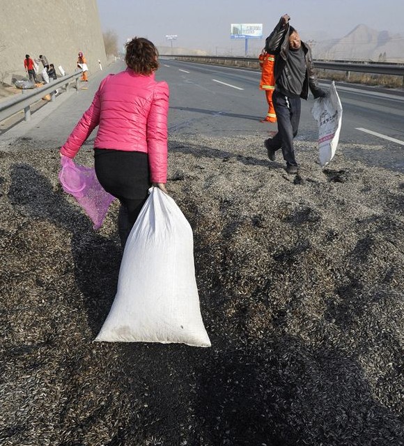 12月4日,在京藏高速公路距兰州西出口7公里处,一辆郑州牌照的大型运输车辆发生火灾,所幸无人员伤亡。据裴姓司机介绍,车上拉载的32吨瓜子大半散落在高速公路上,遭到附近村民的哄抢,损失近20万元。村民一通哄抢后,只留下裴师傅司乘二人傻傻地站在原地。