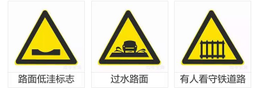 警告标志是警告车辆、行人注意危险地点的标志。警告标志的颜色为黄底、黑边、黑图案,形状为等边三角形,顶角朝上。