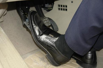 左脚掌踏在踏板上,用膝关节和踝关节伸屈动作踏下和抬起离合器踏板,禁止用脚尖、脚心、脚跟操纵离合器踏板。