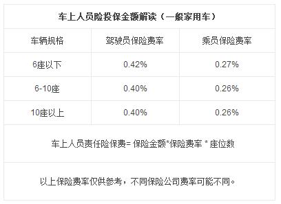 车上人员责任险保额有每人1万、2万,5万和10万四个档次,买保时保额需要统一。下表是车上人员责任险保费的计算方法,消费者可根据自己的需求来选择。