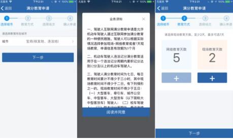 满分采取网络教育+现场教育模式:学习时间7日,每日教育时间累计不得少于3小时,其中现场教育不得少于2日。根据驾驶证记分的不同情形,由系统自动计算现场教育天数。