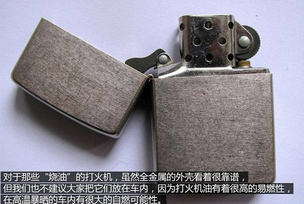 对于那些用油的打火机,我们同样也不建议放在车内,因为这些打火机所使用的油无非就是蒸馏石脑油或煤油,极度易燃,也有一定几率在车内被晒到点着,并且这些打火机与一次性打火机不同之处在于,它们并非一瞬间的爆炸而是持续燃烧,直至“燃油”耗尽,而在燃烧的过程中就几乎不可避免的会殃及甚至点燃车内的其他东西。另外要记得,打火机充气罐及打火机油也是严禁放在车内的,道理同打火机一样。