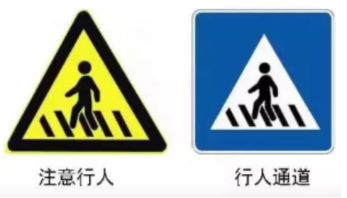黄色背景图标一般是警告/注意类型,而蓝色背景是普通/中性类型,两者主要是提醒注意行人。黄色图标一般是行人比较多的地方,但是不一定有人行横道,白底图标是前方有人行横道,注意有行人。