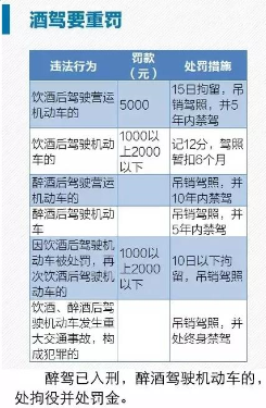饮酒后驾驶机动车的,处暂扣六个月机动车驾驶证,并处一千元以上二千元以下罚款。因饮酒后驾驶机动车被处罚,再次饮酒后驾驶机动车的,处十日以下拘留,并处一千元以上二千元以下罚款,吊销机动车驾驶证。醉酒驾驶机动车的,由公安机关交通管理部门约束至酒醒,吊销机动车驾驶证,依法追究刑事责任;五年内不得重新取得机动车驾驶证。