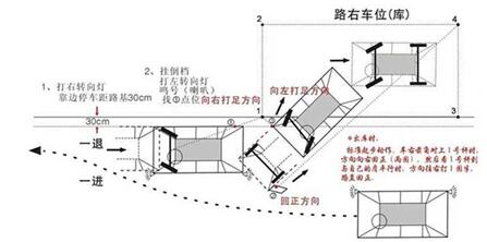 首先,以右轮离库外侧线三十公分,来控制距离,到点位停车。向右打足方向,我亲眼看到有学员一紧张左右不分,记住倒车关键看车屁股,屁股往哪里去,方向盘往哪里打!观察左后视镜,此时速度要慢,看到红外探头,回正方向,此时应该车尾正好与库底成45度,(如果打晚了,那下一步就要提前)然后探出脑袋,看左反光镜中左后轮正中间压库外边线,向左打足方向。(如果刚才回正晚了,此时左后轮一压线就要打足);此期间牢记打方向时必须要压住离合不能太快,详见倒车入库时要点。最后,车头与库水平线平行,或者反光镜中车身与库边线平行,停车,记住不用回正!