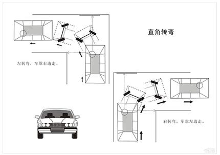 技巧:一般都是转左直角弯,右转方法类似。左转车靠右边走,离开右边线30公分,方法见第一章,有些考场有点位,听教练的;当左车反光镜过转弯左边线,迅速左打死,老规矩,方向快,速度慢,然后车正回轮。