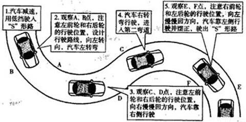 技巧:不管先是左弯还是右弯,方法一样,以先左后右为例:车入道口,当右边线慢慢靠近车头,盖住车头一半时,迅速向左打一圈,然后观察左车头角,左车头角沿着右道钉边线走,别让它超过,要超过了就再往左打一点方向,离得远了就回一点方向。(原理:车头离开道钉近右轮就离开道钉远;反之,车头离开道钉远,后轮就要压了)。第一个弯通过,回正方向,下一个弯,方法类似;最后出弯时,别回太快,慢慢沿着两侧边线,让车在路中。