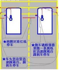 最后就是倒车的关键心法了:修。倒车的关键就在修,因为现在不允许中途停车,所以上文中提到,到了点位要提前些打,切记不能晚打!因为晚打肯定就修不了,进不了库压外侧线了。因为提前打,所以很少能正正好好不用修正直接入库,多半会压内侧线。那下面就是关键了,怎么修?第一次修正:当你打完方向后,往左打就看左反光镜;往右打就看右反光镜。打完后,当那一侧的最前端端点(有些考场是标杆)出线后,观察车身与标杆或者内侧边线的距离在两只之内就回半圈,即回180度(另一个方法是,边线与车身夹角,在1点钟方向以内时回半圈);当后门把手入库后,即后轮入库后,第二次修正,怎么修?记住口诀:看车屁股,哪边宽(车屁股离边线远)修那边,方向盘往哪里修,修正幅度必须在90度内,车正(可以车头判断,也可看左右边线与车身平行)回正。当后门把手后沿靠上后库边线,停车。