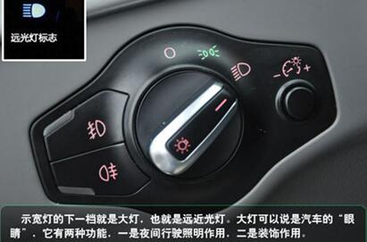 示宽灯的下一档就是大灯,也就是远近光灯。它的主要作用是汽车行驶时照明,原车的远近光不可以同时打开,也就是远近灯光的切换,切换手柄在方向盘左下侧,上下拨动可以切换远近光。经改装了的灯,打开近光时近光亮,打开远光时远近光同时亮。