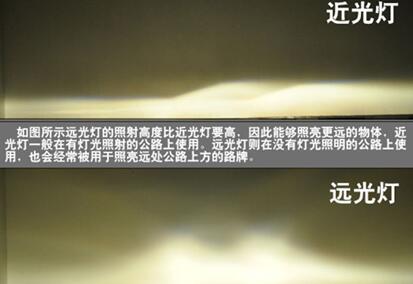 如图所示远光灯的照射高度比近光灯要高,因此能够照亮更远的物体,近光灯一般在有灯光照射的公路上使用。远光灯则在没有灯光照明的公路上使用,也会经常被用于照亮远处公路上方的路牌。
