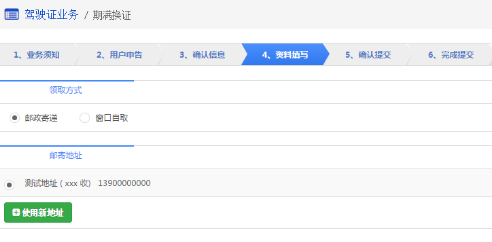 如果选择邮政寄递的方式,用户需认真填写驾驶证邮寄地址等相关信息。用户可以设置默认地址,删除地址,并且使用新地址。点击“使用新地址”,可以新增邮寄地址。