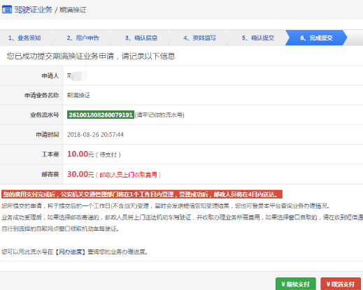 5、下一步后,界面用户的驾驶证信息、领取详情以及需要缴纳费用信息,如果平台已开通在线支付功能,显示在线支付详情。再次确认信息以后,点击“获取验证码”,系统会发送6位验证码到用户绑定的手机,用户输入手机验证码后,点击“完成”。