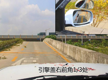 当引擎盖右前角1/3处与路边线重合时,即可保持方向直行,同时通过右后视镜观察整个车身与边线的位置关系,目的是保证车身与路边线距离在30cm以内。