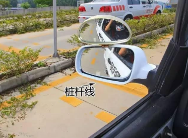 当左后视镜下沿与第二条粗黄实线(桩杆线)重合时,即可踩刹车踩离合停车。