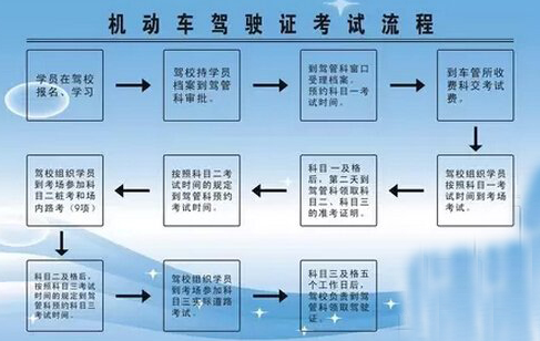 1、学车报名;2、学车体检;3、考科目一;4、考科目二;5、考科目三;6、考科目四 (安全文明驾驶宣誓);7、领取驾照。下面小编再详细介绍一下考驾照流程。