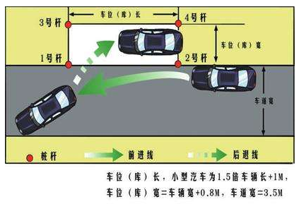后视镜法:当从右后视镜中看不到右边库前横黄线时,慢慢向右打死方向。