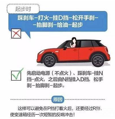 常见错误方式:踩刹车-打火-挂挡(P到D)-松手刹-抬脚刹-给油-起步。