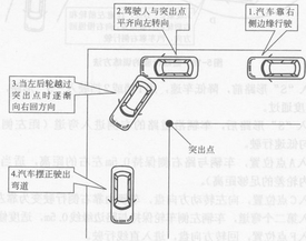 三、汽车继续行驶,当我们用余光观察到内直角突出点与驾驶人在一条线上时,迅速将方向盘向左打到底;