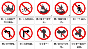 2、禁令标志的颜色,除个别标志外,为白底,红圈,红杠,黑图形,图形压杠。