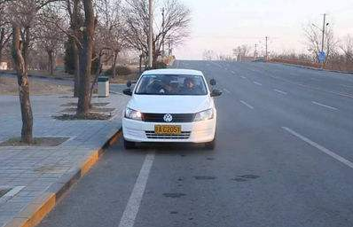 5、向左回转方向(第三把轮,车正轮正)迅速停车。在车辆近停时,稍许抬起制动踏板减缓刹车惯性,平稳停车。