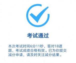 "学法减分 "考试时间为 20 分钟,每题答题时间最长 60 秒,进入下一题后,已答题目不再允许修改、回看。系统将随机从题库中抽取 20 题,题型为判断题、单项选择题、多项选择题。答对 18 道题及以上为合格,答错或者未答累计 3 题的,系统自动判定考试不合格并退出考试。