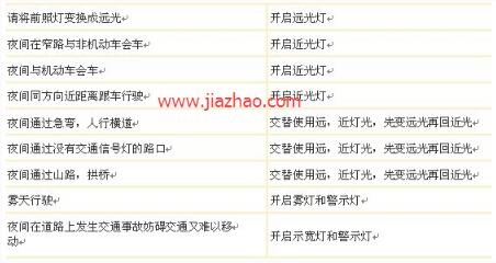2、 夜间在没有路灯、照明条件不良条件下行驶时灯光使用和夜间在有路灯照明良好的道路上行驶时灯光使用