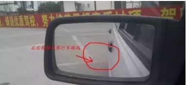 2、打死方向盘后,看后视镜,通过后视镜观察库角和车身延长线的距离(下图是左倒库, 教练一般认为延长线不好看,指定让你看前把手和库角距离)