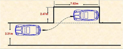 2、挂一档,与库线平行行驶并与之保持小于半米大于30CM的距离。当车库的前边线消失在右侧后视镜时,迅速打开方向灯,踩下离合器,挂倒档,同时向库方向打死方向盘。