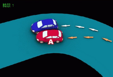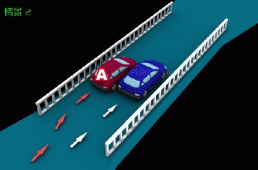 情景2:行径交叉路口、窄桥、陡坡、隧道时超车的,图中所示为A车负全责。