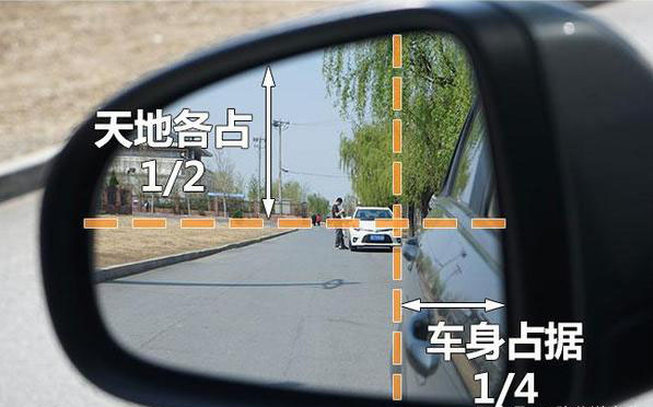 第二步——调右后视镜。以地平线为基准,将后视镜调节至地面占据整个地面的三分之二处,同时保证车身身的边缘只占据整个镜面的四分之一就可以了。右侧后视镜相比于左侧调试难度稍高,学员们可以多试几次。