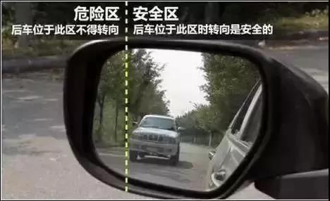 5.当左后视镜发现车辆在安全区,位于后视镜中央,说明后车与你的车车距有15-20米,可以正常地进行转向操作。