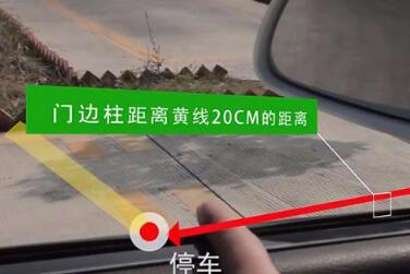 2、车头正,方向迅速回正,当左侧后视镜下沿距离黄色虚线20cm的时候,停车;