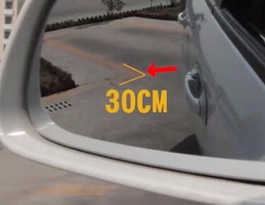 3、车子缓慢倒退过程中,观察右侧后视镜,当右侧车身距离库角30cm左右距离的时候,回正方向;