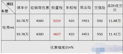 以10.78万的H6升级版手动四驱都市型为例,购置税减半后消费者大约能剩下4600元,综合优惠幅度约4%。