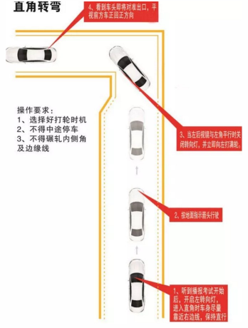 (2)即将驶入直角时先开启左转向灯,将车身尽量靠近右侧边线保持车辆直线行驶。