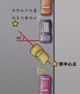 3、调整好姿势后,右打死方向盘,行驶至与旁边汽车的夹角为45°(目测大约是45°就行)