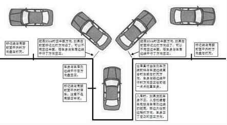 一个边距(右车轮离库边线30厘米),三个点位(往右打死方向盘,回正方向盘,往左打死方向盘,打方向盘速度要快)。