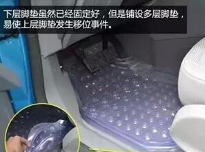 部分车主为了方便清洁,会在织物材质的脚垫上再铺设一层橡胶、PVC等易于清洗的脚垫。据网上调查显示,铺设双层脚垫导致脚垫移位的发生几率十分高。双层脚垫的铺设使得上层脚垫无法固定,容易发生移位事件。因为脚垫都很新,所以车主往往更容易疏忽,意外发生的几率大大提升。