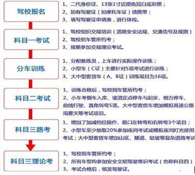 一般来说,学车都需要2个月的时间,但这个时间跟自己的时间安排、学习能力还有驾校安排都有很大关系。下图是考试流程: