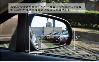 因为驾驶座位在左侧,且司机对于车的右侧情况较难掌握,所以最好把右视镜调整在上下位置,地面面积应大些,约占镜面面积的2/3,而左、右位置则同样调整至车身占据镜面范围的1/4。