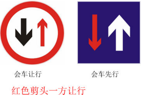 一般出现在一些比较窄的道路上,抓住标志的重点,红色箭头一方让行。是指示标志,指示驾驶员会车时哪个方向先行,所以是蓝色的正方形标志。