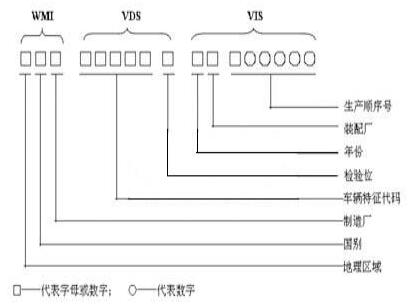 车辆识别代号由世界制造厂识别代号(WMI)、车辆说明部分(VDS)、车辆指示部分(VIS)三部分组成,共17位字码。