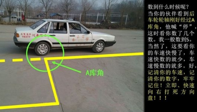 以桑塔纳为例,当桑塔纳车身右侧靠近外直角边线,左、右前车门三角窗中间对准内、外直角线时方向分别向左再向右打到底,车正时回正方向即可顺利通过。