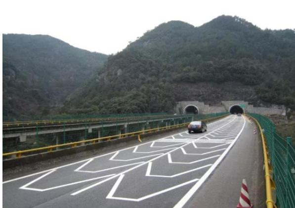 二、错视觉标志。这个标志一般在高速公路的隧道口,也是为了提醒车主减速。它的形状与波浪相似,分为很多层,但是划出的线是平的,所以给车主的感觉就是车道在变窄,下意识就会减慢车速。