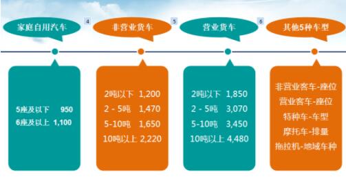 普通的家用小汽车,2-5座的车,基础费率是950元。6-8座,基础费率是1100元。