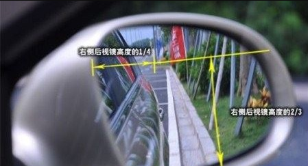由于驾驶座位在左侧,所以司机对车身右侧的情况较难掌握,因此,右侧后视镜在调整上、下位置时,地面面积占镜面的2/3,能看到后轮的轮眉(车轮上方突出的部分,弯曲,像眉毛),而左、右位置则调整至车身占据镜面范围的1/4。