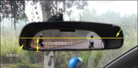 左、右位置调整至镜面的左侧边缘,切至自己在镜中影像的右耳际,一般情况下,从中央后视镜里看不到自己,而上、下位置则是把远处的地平线置于镜面中央。调整要领是:水平摆中间、耳际放左边,即远方的水平线横置于中央后视镜的中线位置,然后再移动左右,把自己右耳的影像放在镜面的左缘。