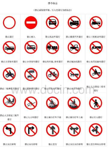 主要标志可分为四种:①指示标志:通常为圆形和矩形,蓝底白色图案。用于指示车辆和行人按规定方向、地点行驶。②警告标志:通常为等边三角形(或菱形),黄(白)底黑(红)边,黑色(或深蓝色)图案。用于警告驾驶人员注意前方路段存在的危险和必须采取的措施。③禁令标志:通常为圆形,白底红边,红斜杠黑色图案。是根据街道、公路和交通量情况对车辆加以禁止或适当限制的标志。④指路标志:通常为矩形,蓝(绿)底白字和白色图案。用于指示市镇村的境界,目的地的方向、距离,高速公路的出入口、服务区和著名地点所在等,并沿途进行各种导向。