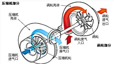 增压涡轮发动机的增压装置并不复杂,由涡轮室和增压器两部分组成。涡轮室的进气口与发动机排气歧管相连,排气口则接在排气管上。增压器的进气口与空气滤清器管道相连,排气口接在进气歧管上,最后涡轮和叶轮分别装在涡轮室和增压器内,二者同轴刚性联接。
